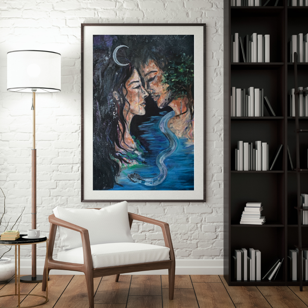 This painting inspired by the story of Adam and Eve began as a different painting entirely. Through a season of personal pain and redemption, finding Jesus in a way that fully shakes the core ofwho I was as a broken and dark sinner I dreamt of a serpant and knew it was supposed to finish this piece that had long sat unfinished on my easel.